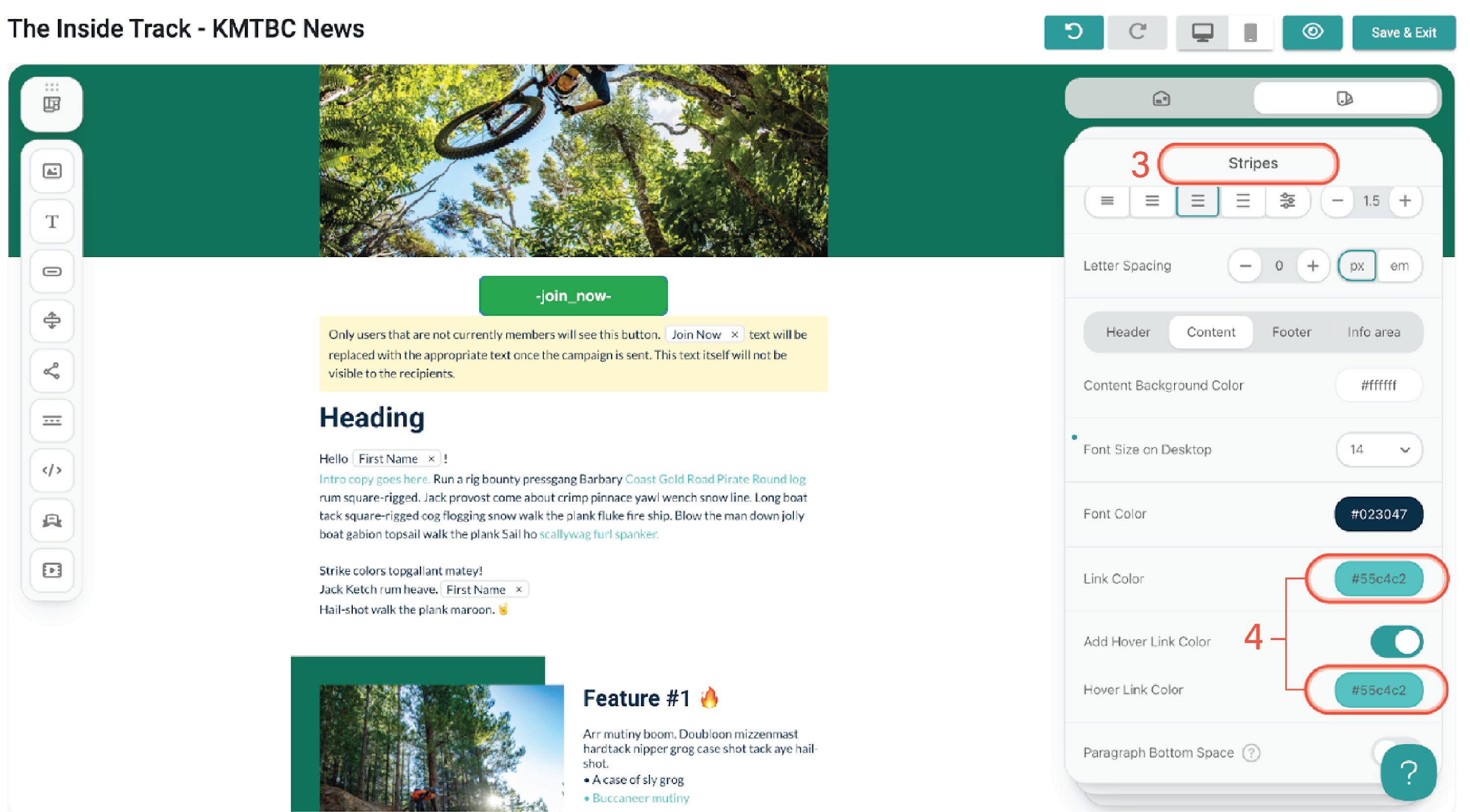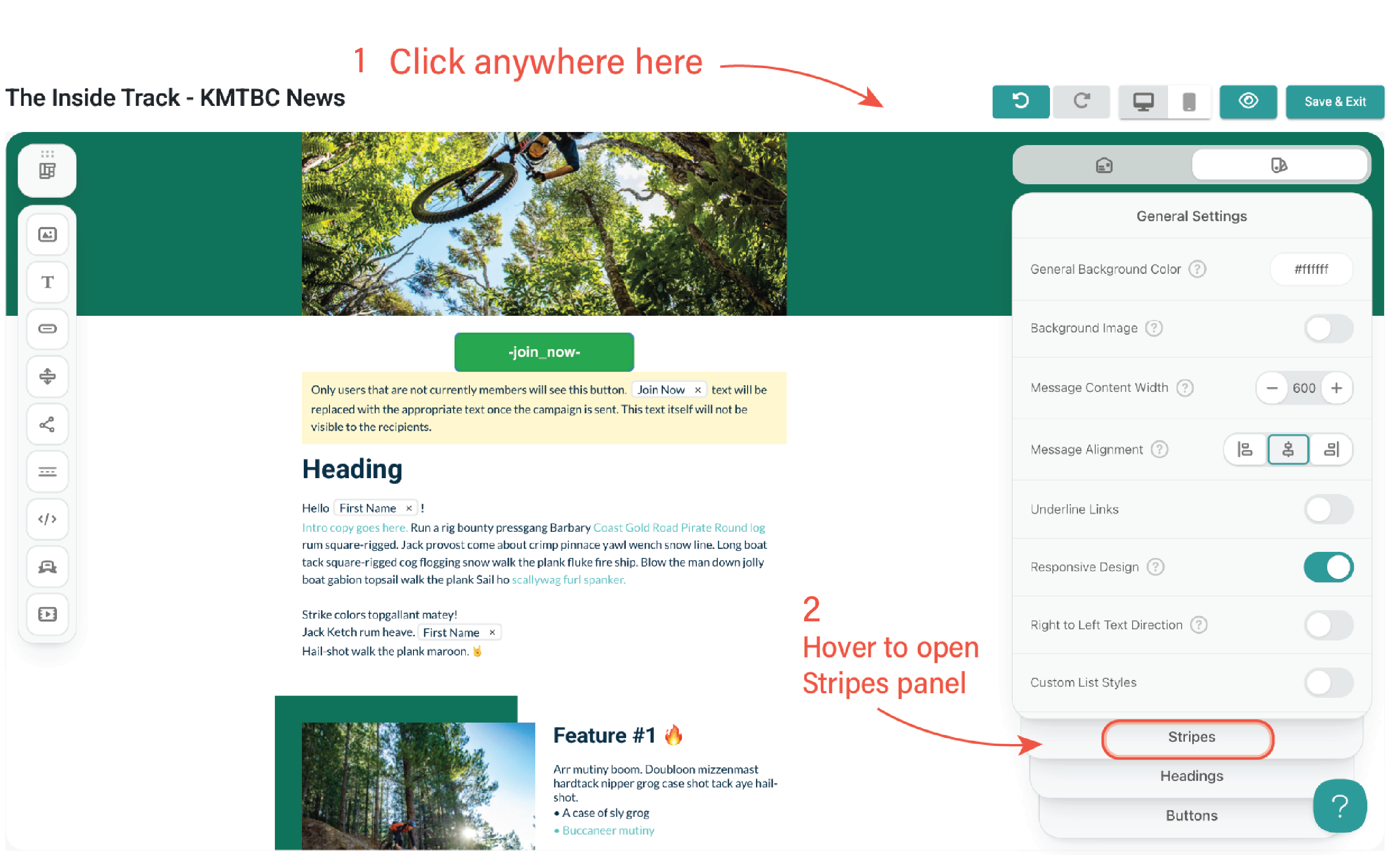 Paragraph Styles - To set these up, make sure that nothing on the page is selected (the easiest way to do this is to click on the white area of the page next to the title of the email campaign.) When nothing is selected, this will bring up the General Settings block at the right hand side.