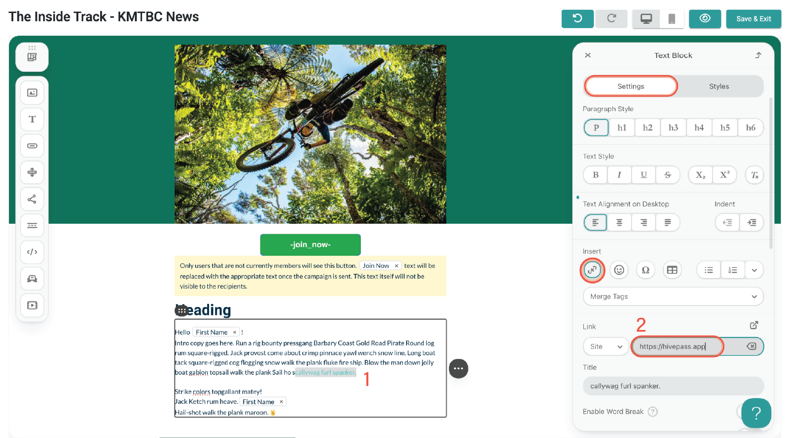 - Add your link by putting your cursor in the correct place in the copy and then click the Link icon in the Text Block at the right hand side
