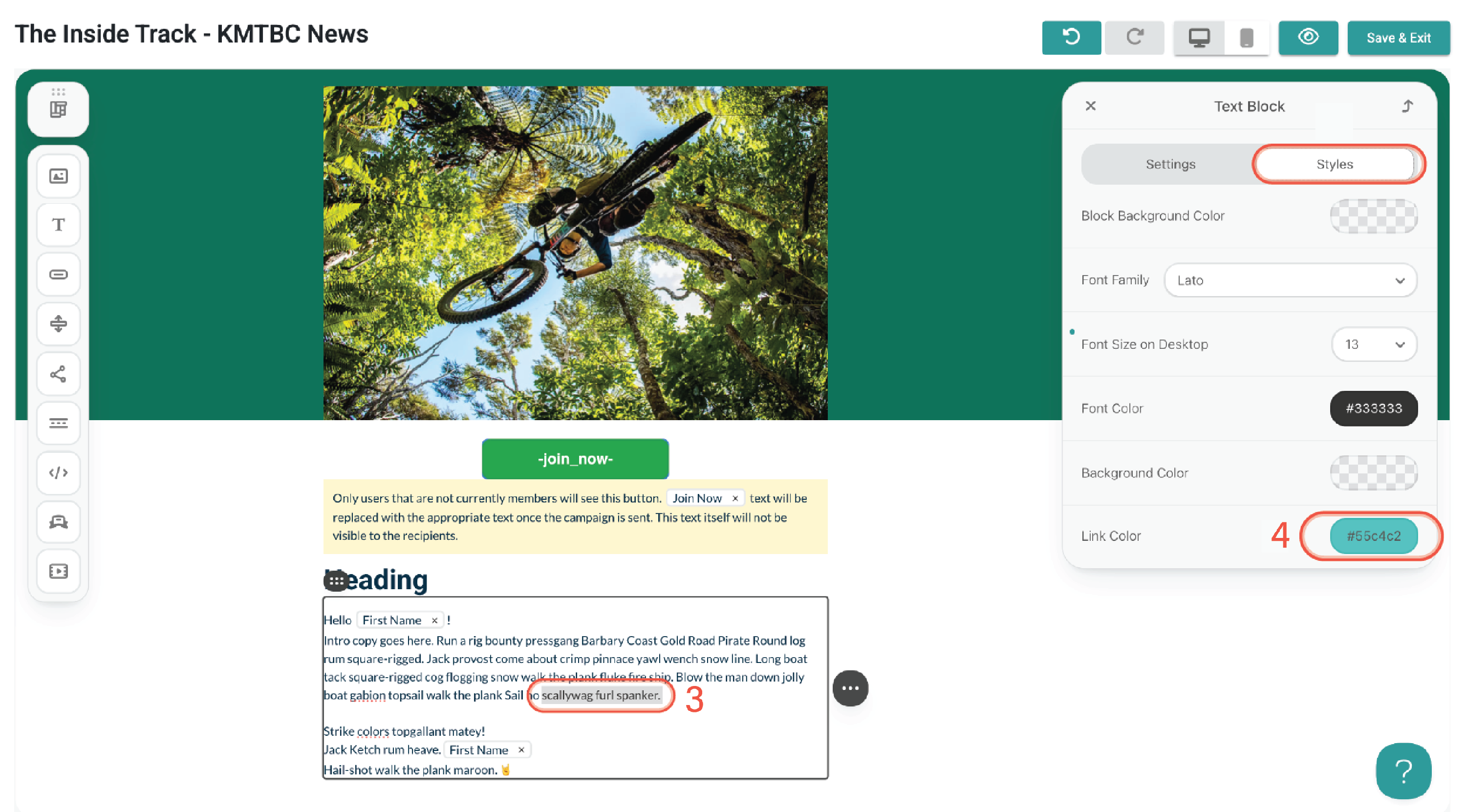 - With the link text highlighted, go to the Styles tab in the Text Block at the right hand side