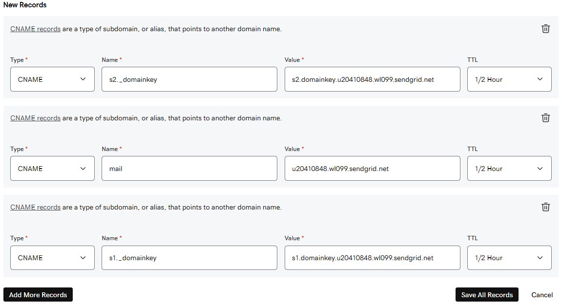 - Follow the instructions for your specific provider to enter the provided records into the DNS for your domain