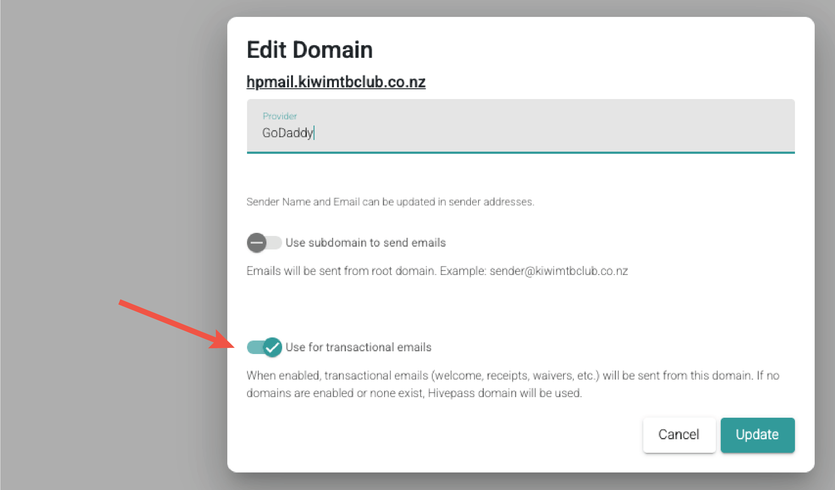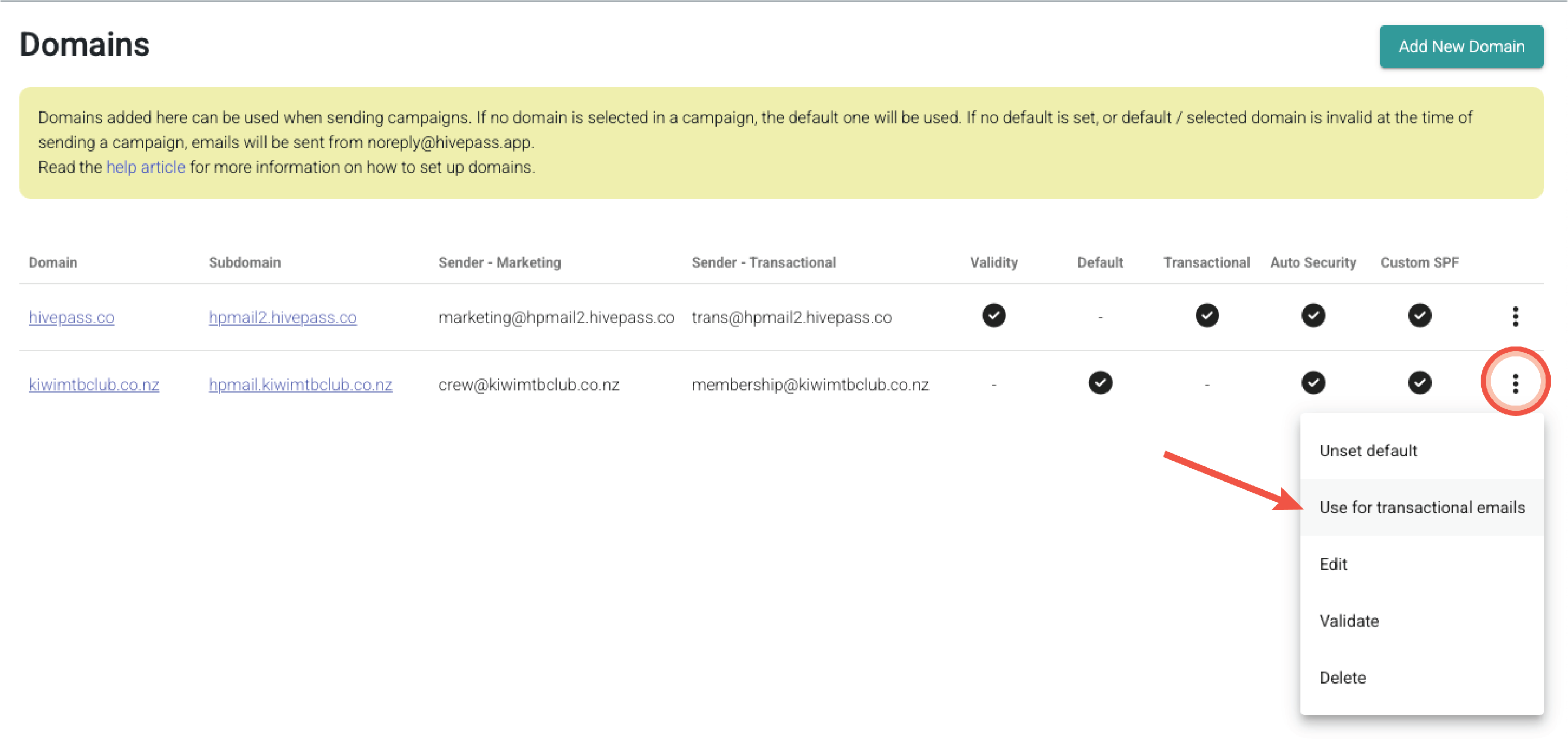 - Simply select 'Use for transactional emails' here. A tick will appear under the 'Transactional' column on the Domains list page