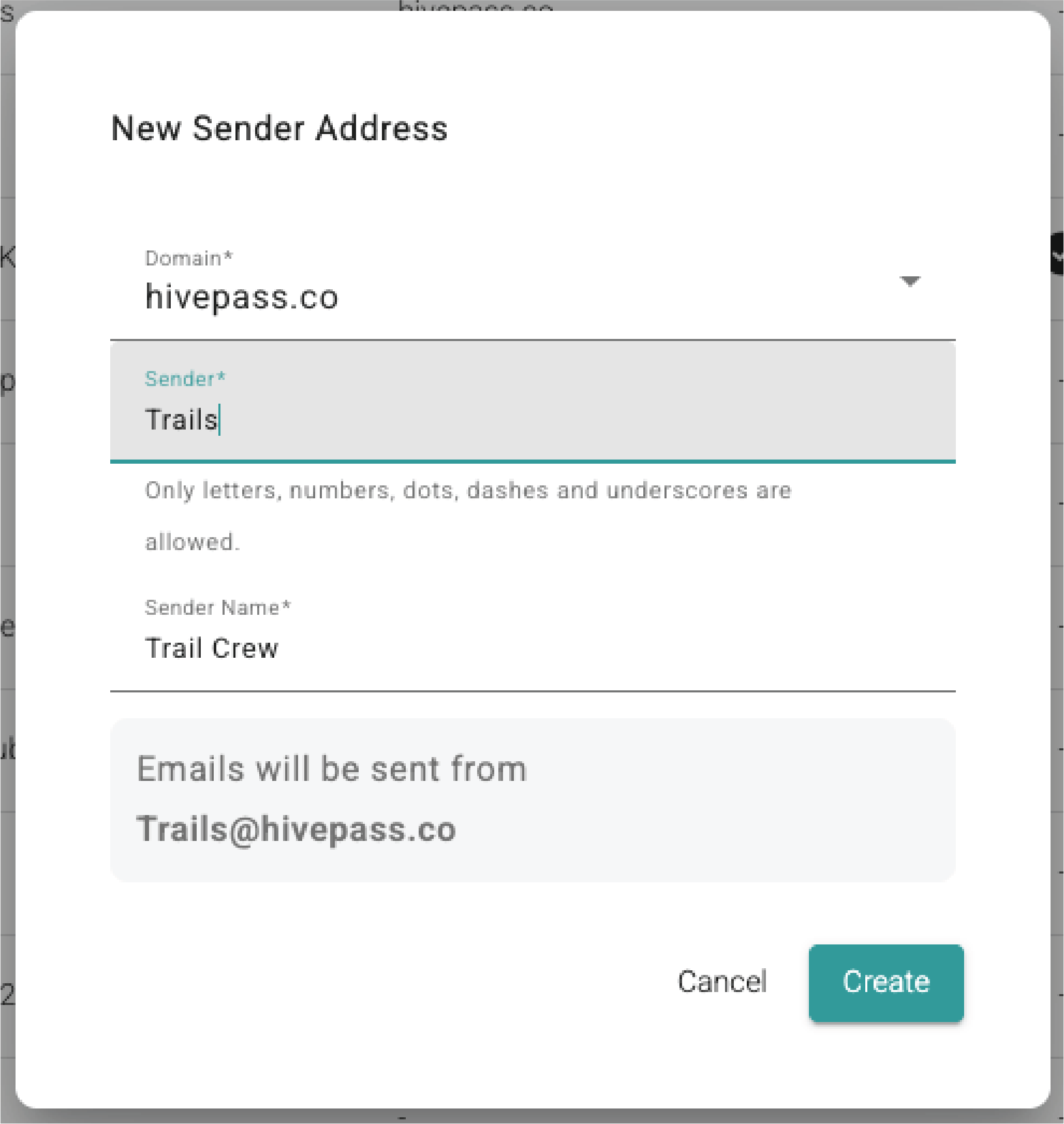 - Enter your sender, and your sender name. e.g: Sender: Trails, Sender name: Trail Crew.
