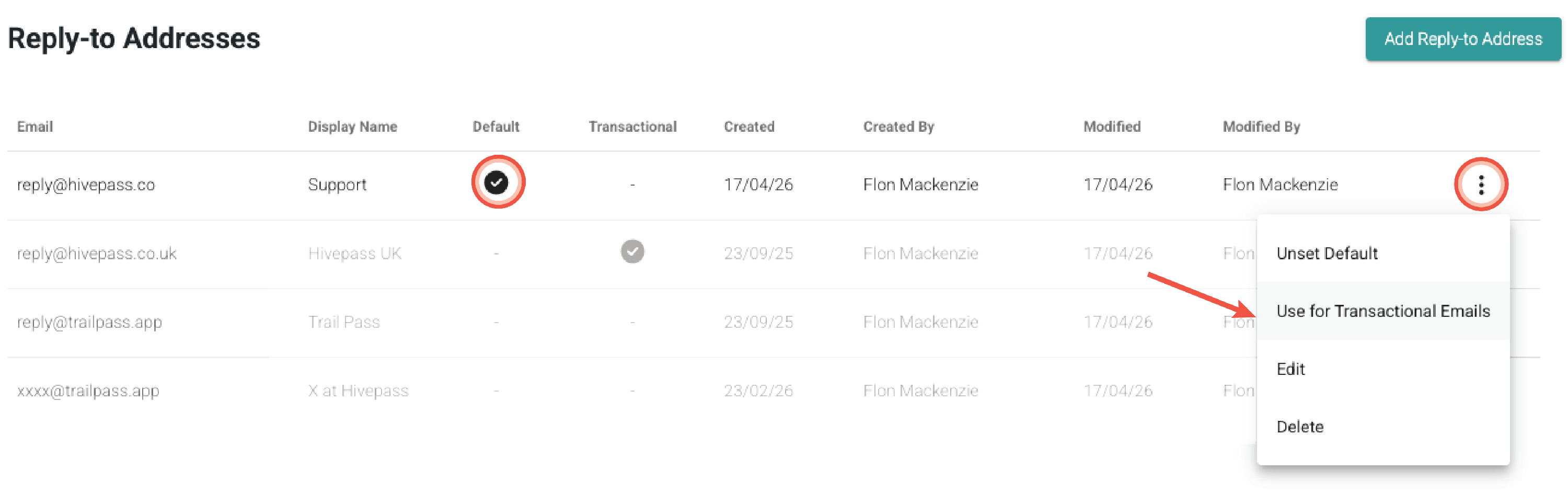 - This reply-to address can be set as the Default using the three dots menu at the right hand side