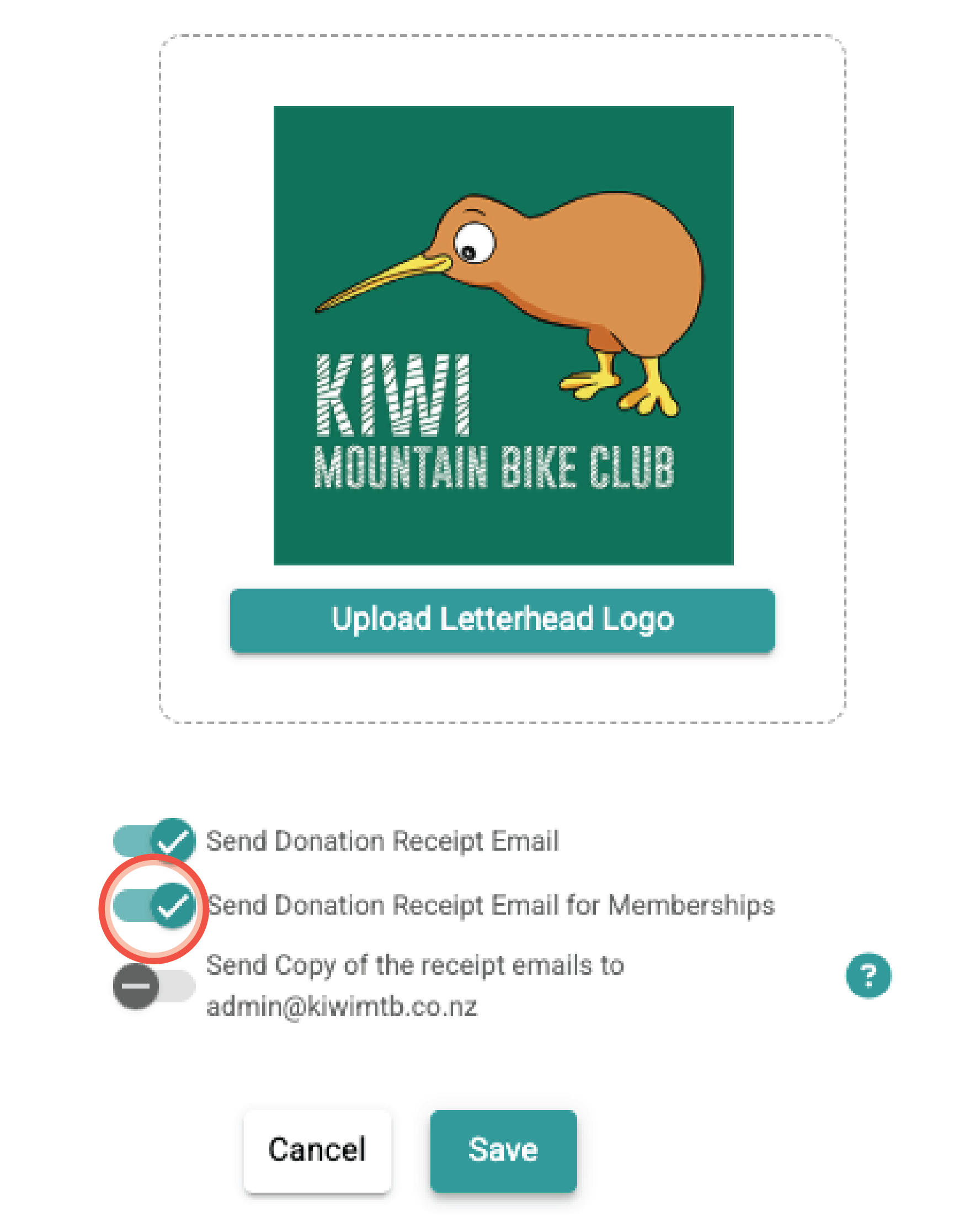 - At the bottom of the page, toggle on ‘Send donation receipt email for memberships’
