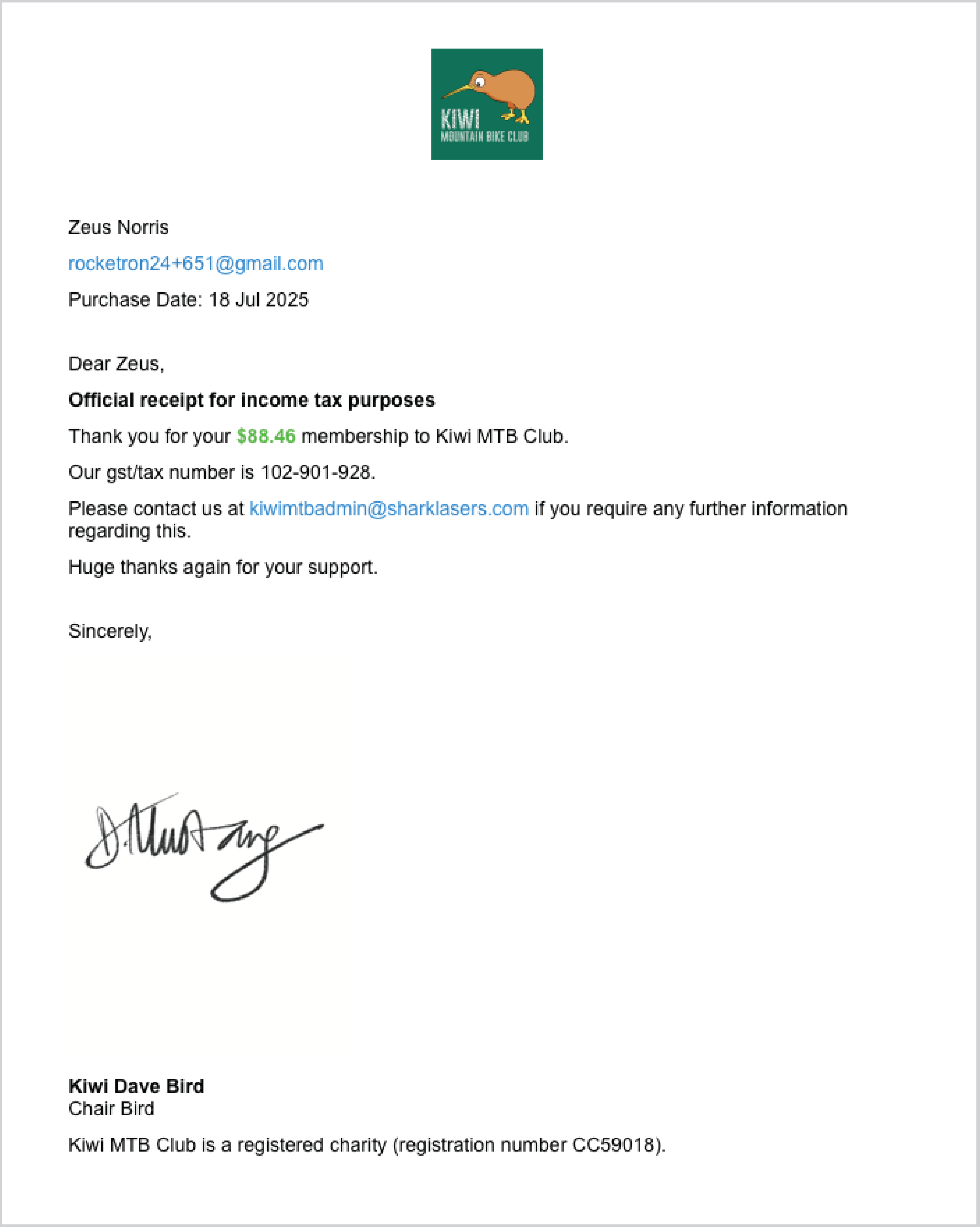 Membership receipts can now be emailed automatically to members when they pay for a membership or renew.