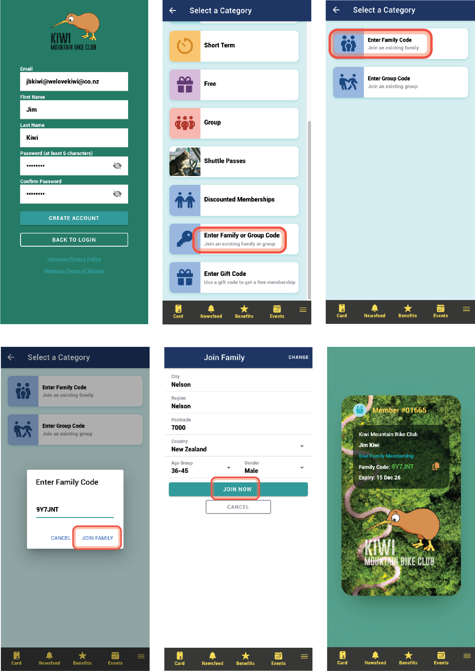 They then give the family code 9Y7JNT to other users so that they can activate their membership in the app on their own device.