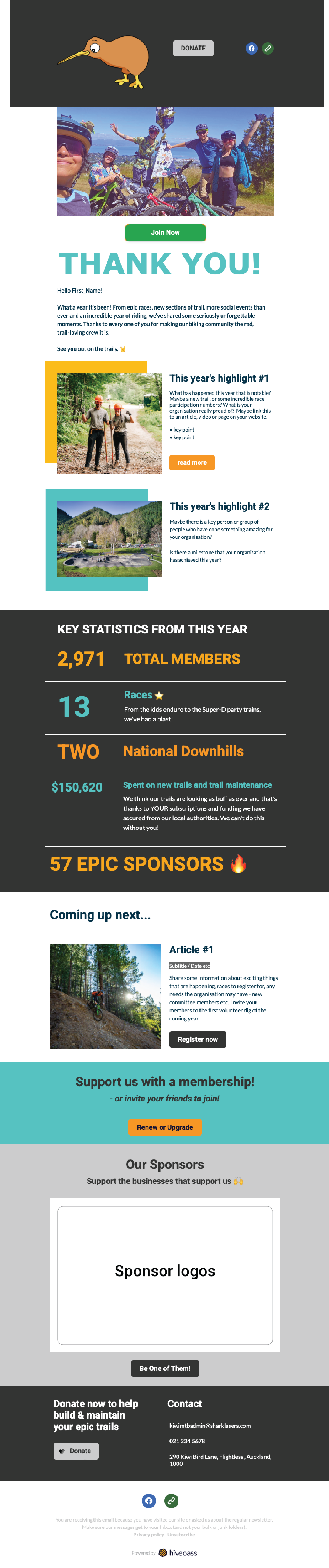 Always include a section to thank the people who made the year possible – this sets a grateful tone and strengthens community spirit. Acknowledge the volunteers, trail builders, committee members, event organisers, sponsors, and anyone else who contributed.