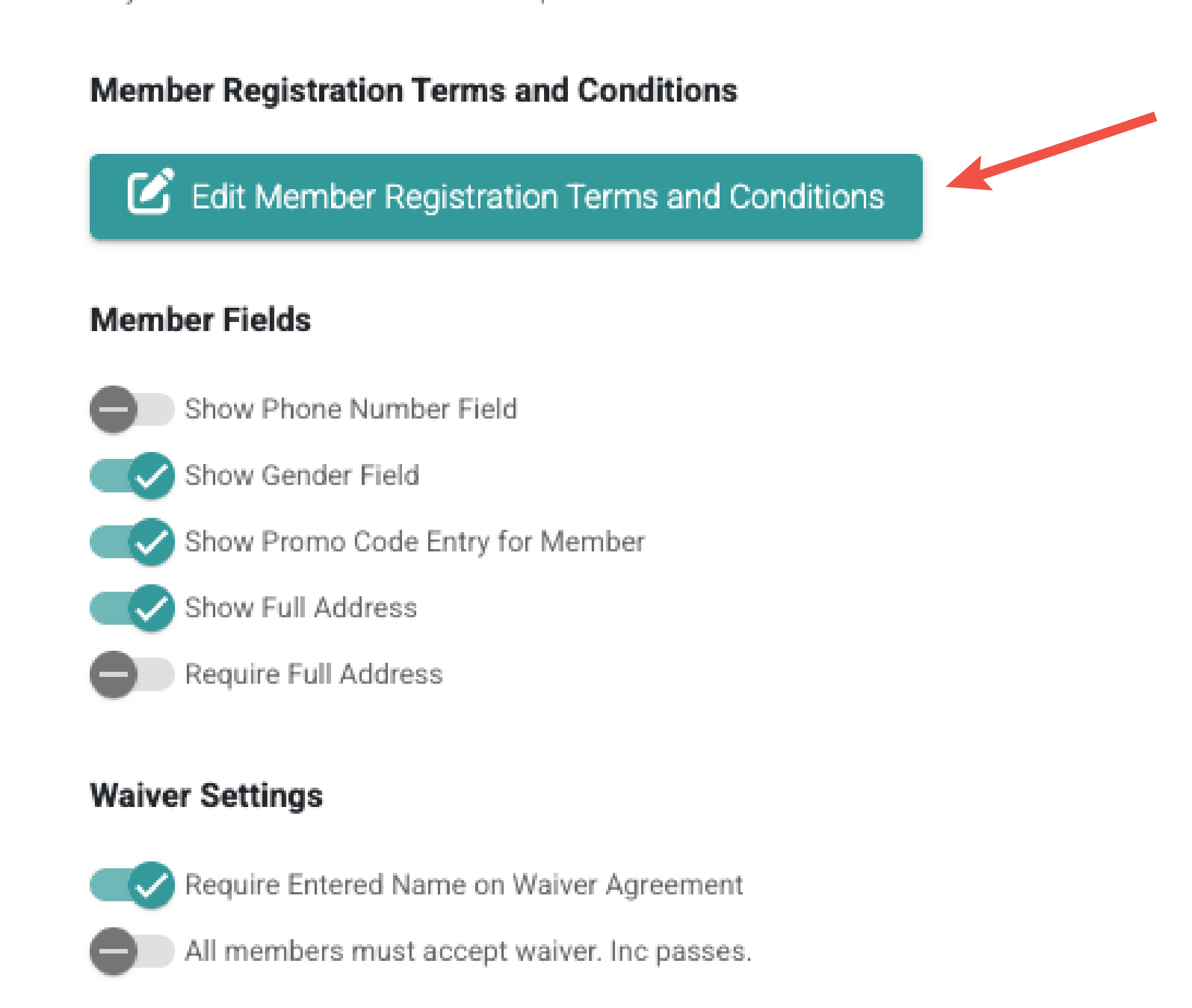 - Go to Settings > Organisation Settings and scroll down to Member registration Terms and Conditions