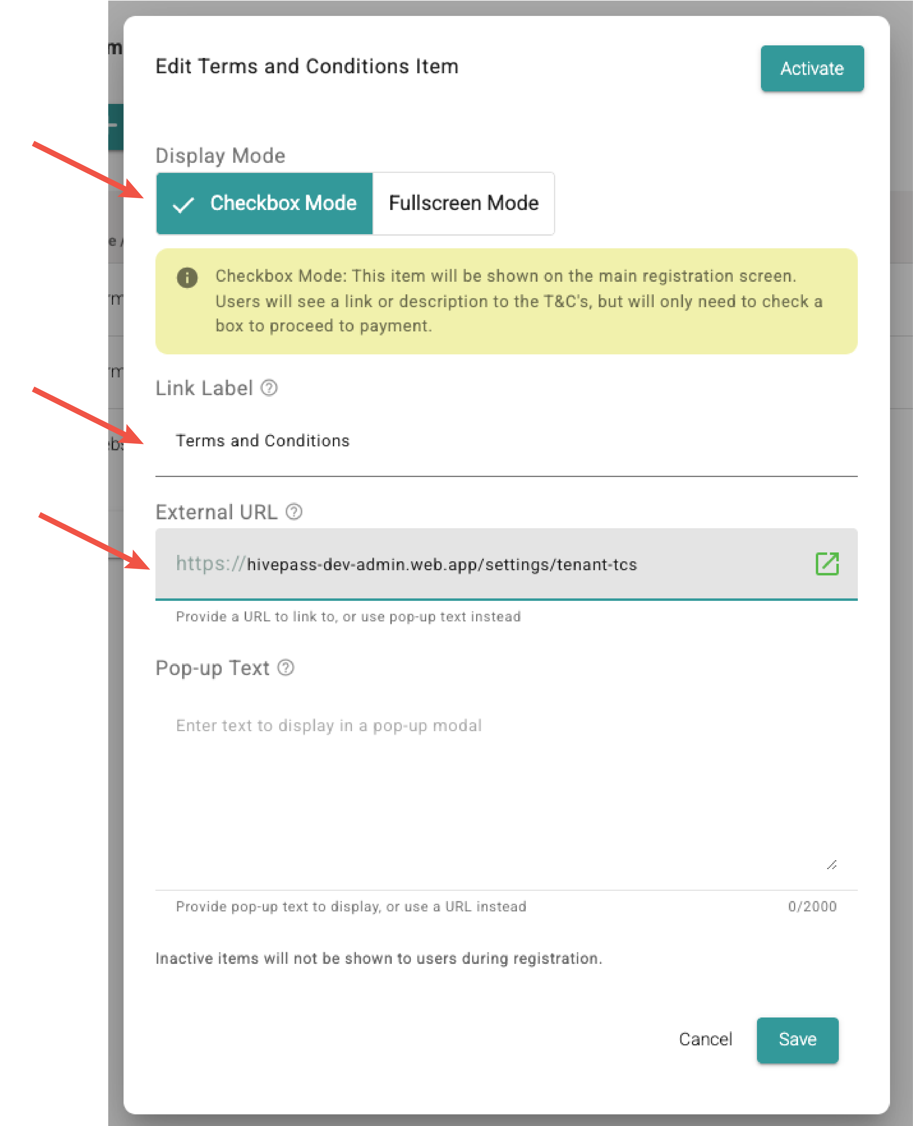 - Pop-up Text: If NOT using a url, add the T&C's copy here and when the user clicks on the link, a pop up box will open.
