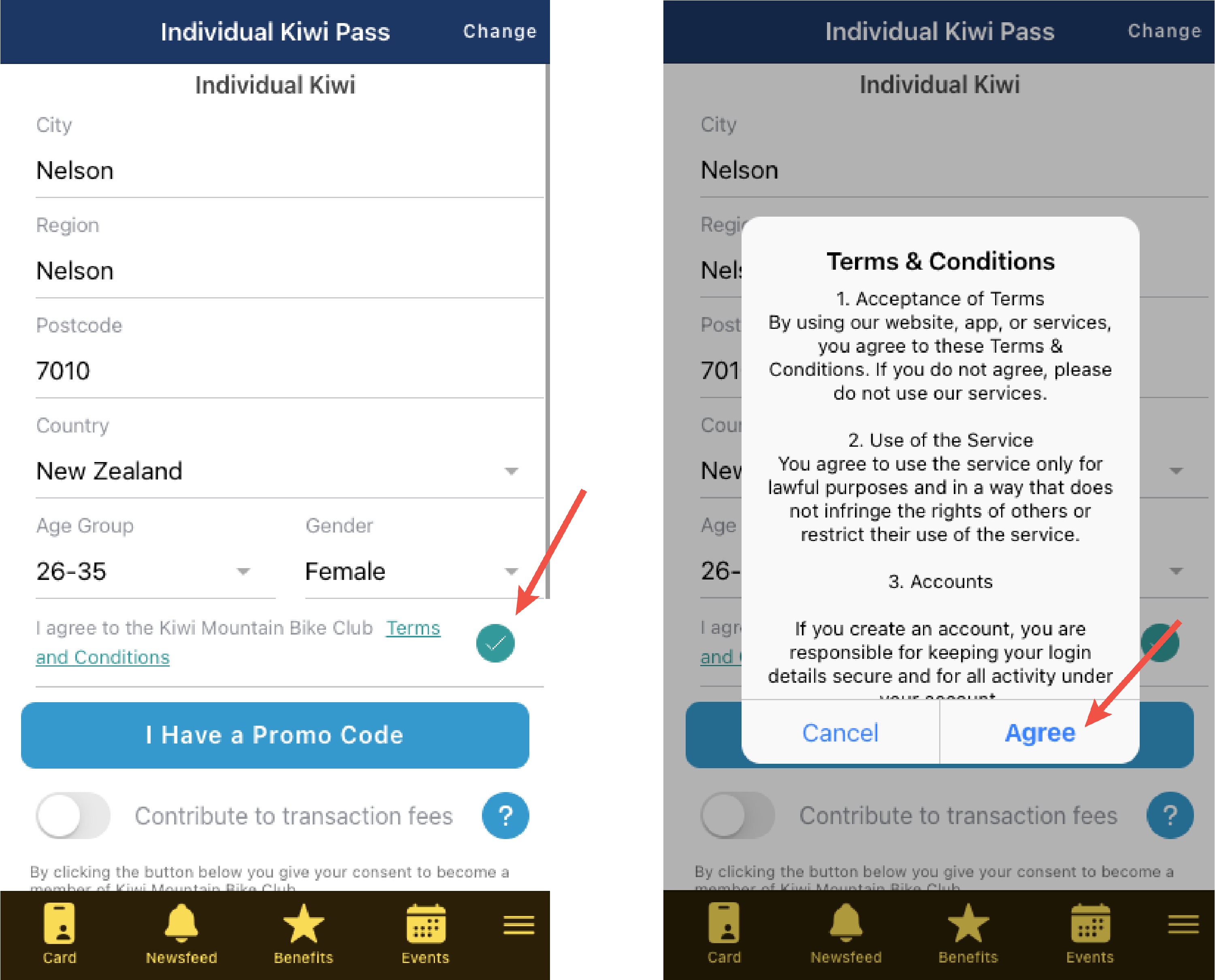 Right: The user can view the T&C's in a pop up screen by clicking the Terms & Conditions Link. This same link will take the user to the external url if added in settings.