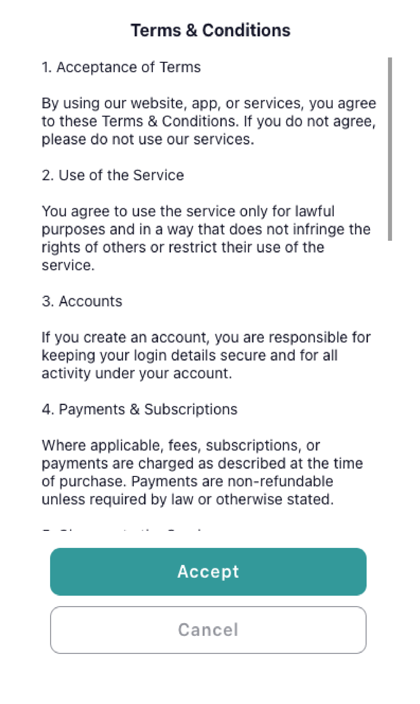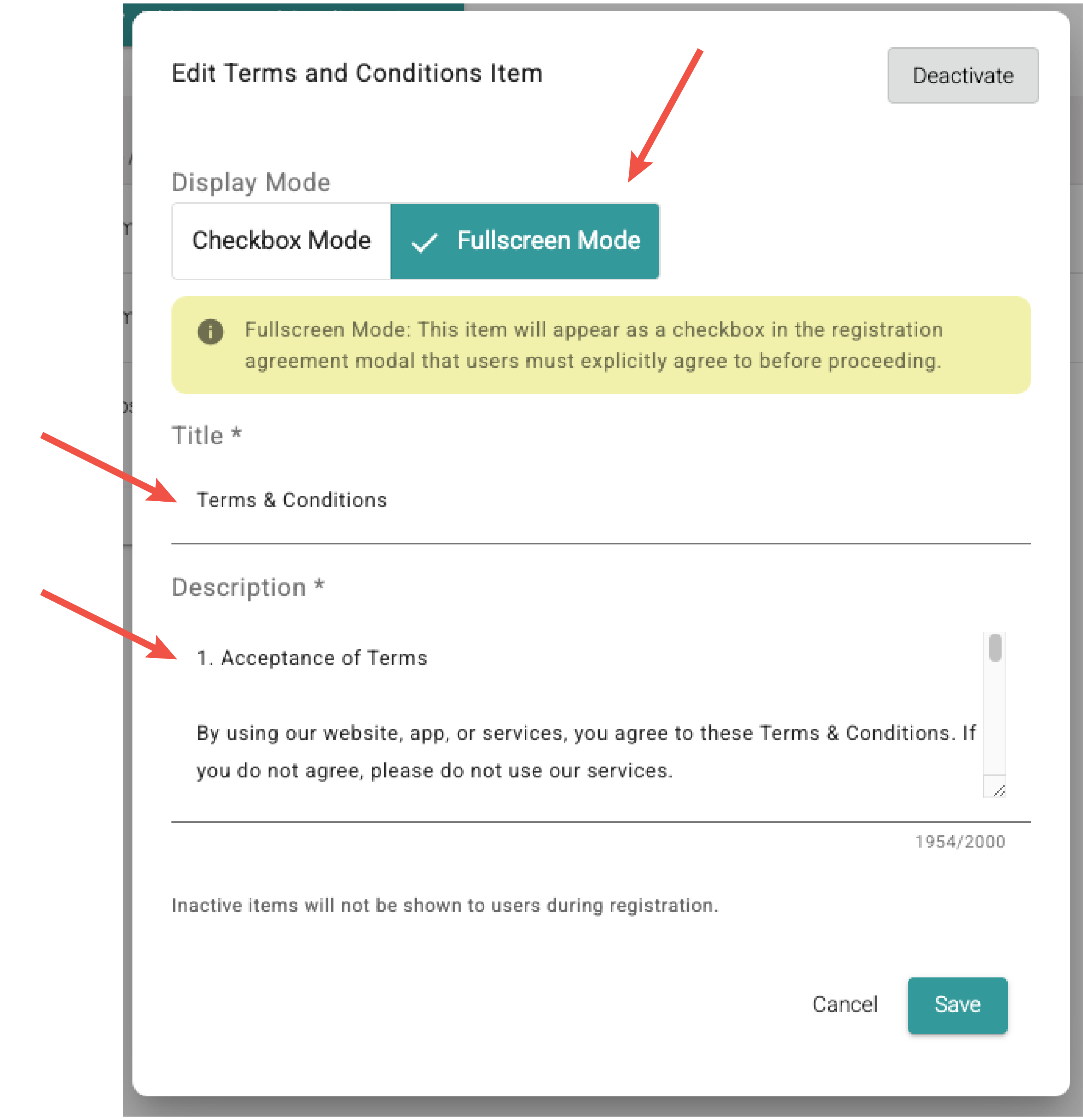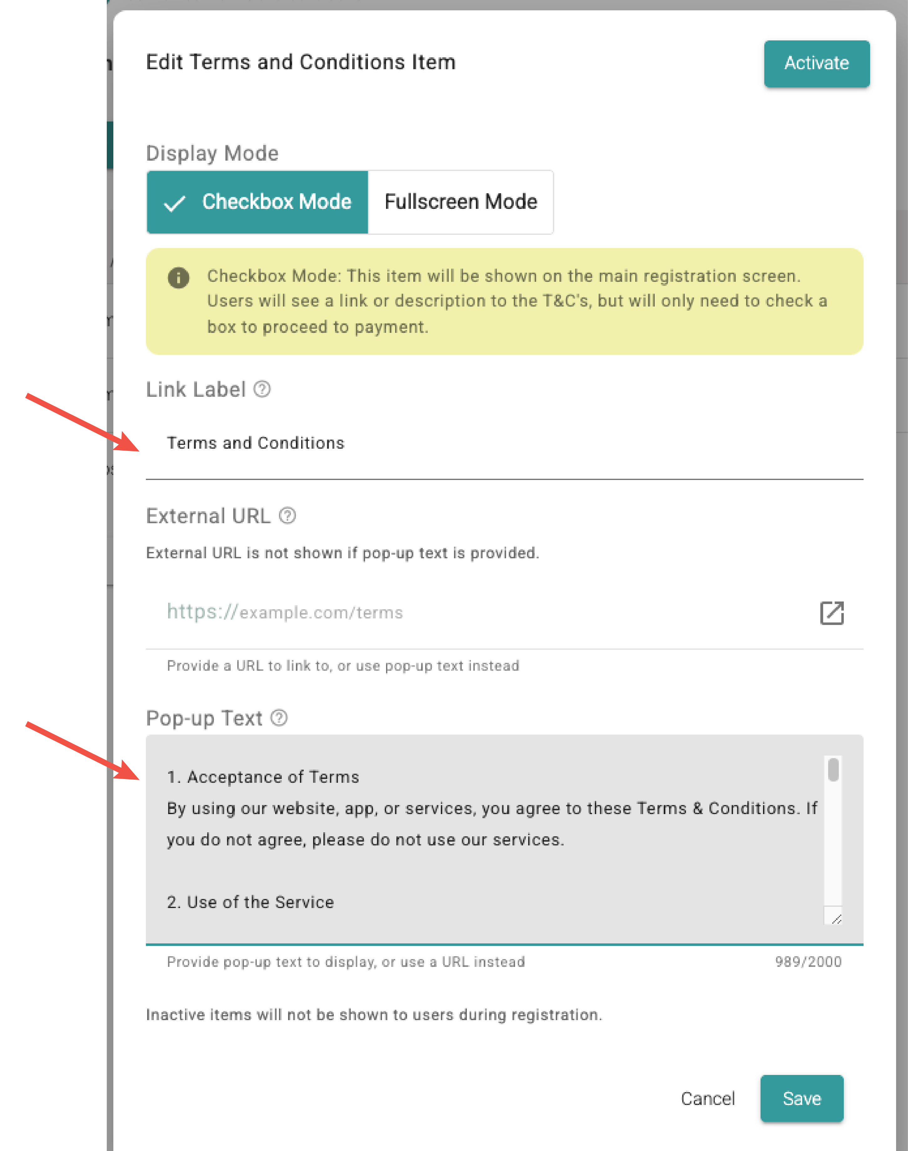 There are two ways to display the Terms and Conditions to the user: Checkbox or Fullscreen mode.