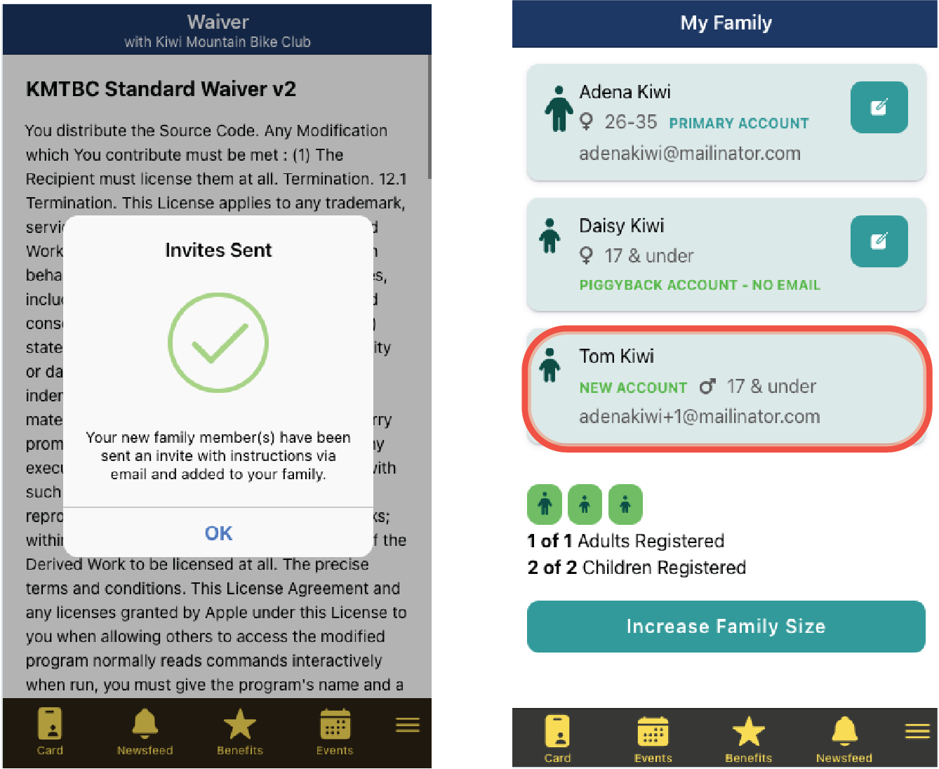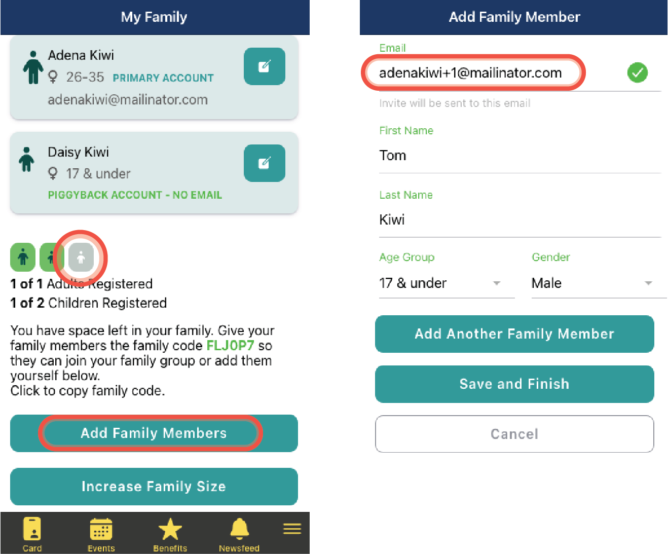 - The family members details are now visible in the app. They will also be sent an email with login details notifying them that they have been added to the family.