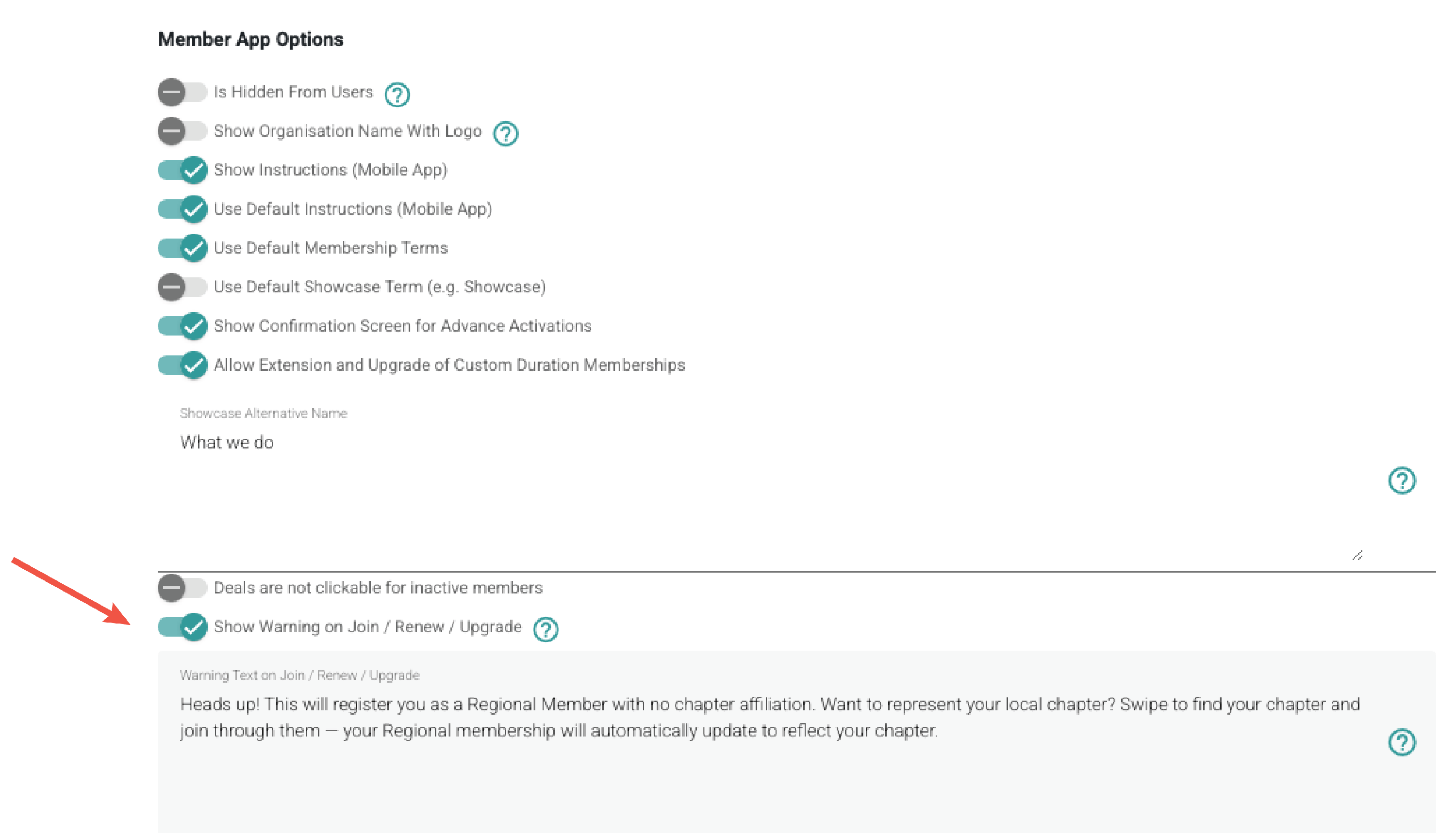 - Approximately half way down the page, under Member app options, toggle on 'Show warning on Join / Renew / Upgrade.'