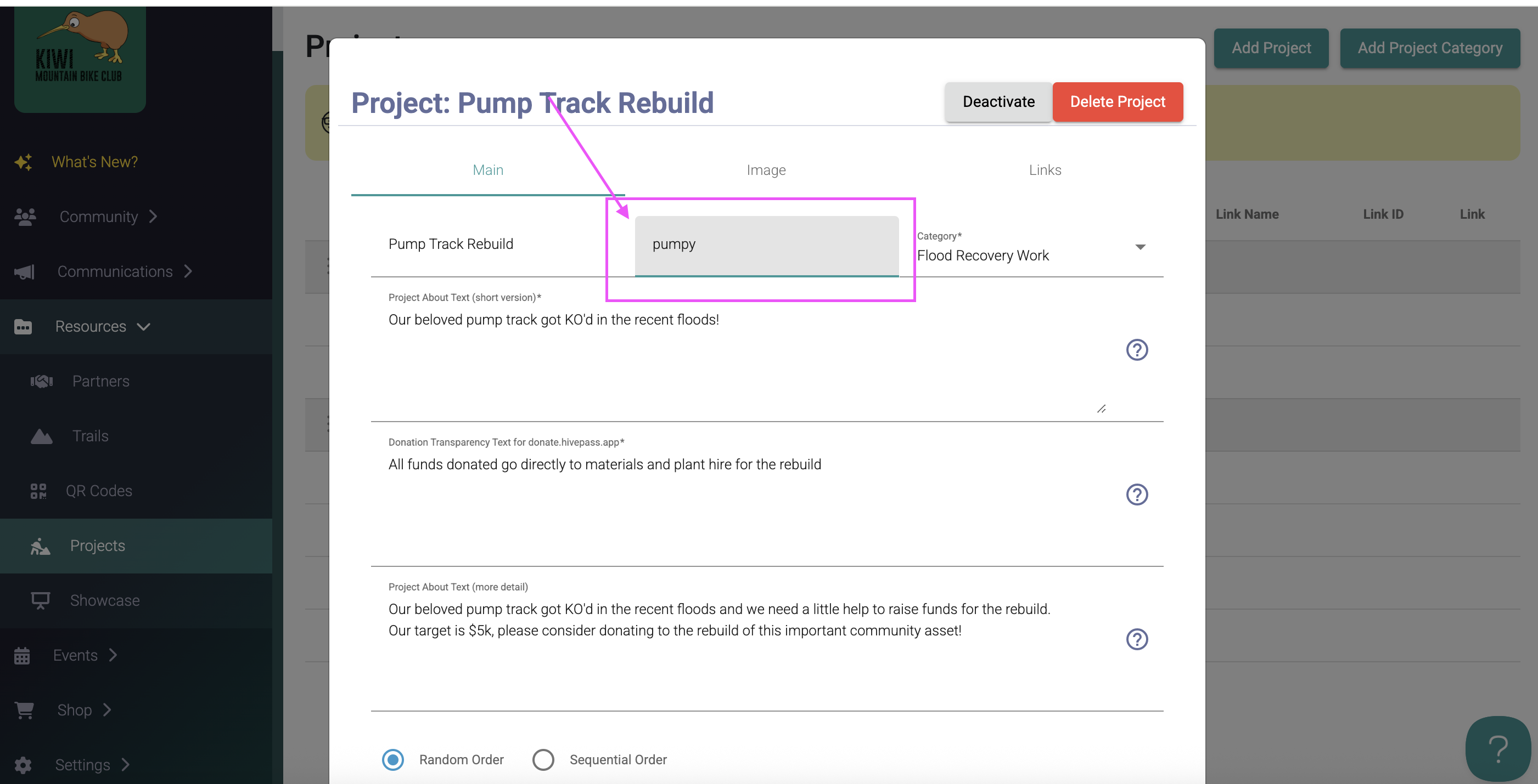 - Create and manage your projects in: Resources > Projects. They will appear on the donate.hivepass.app web page.