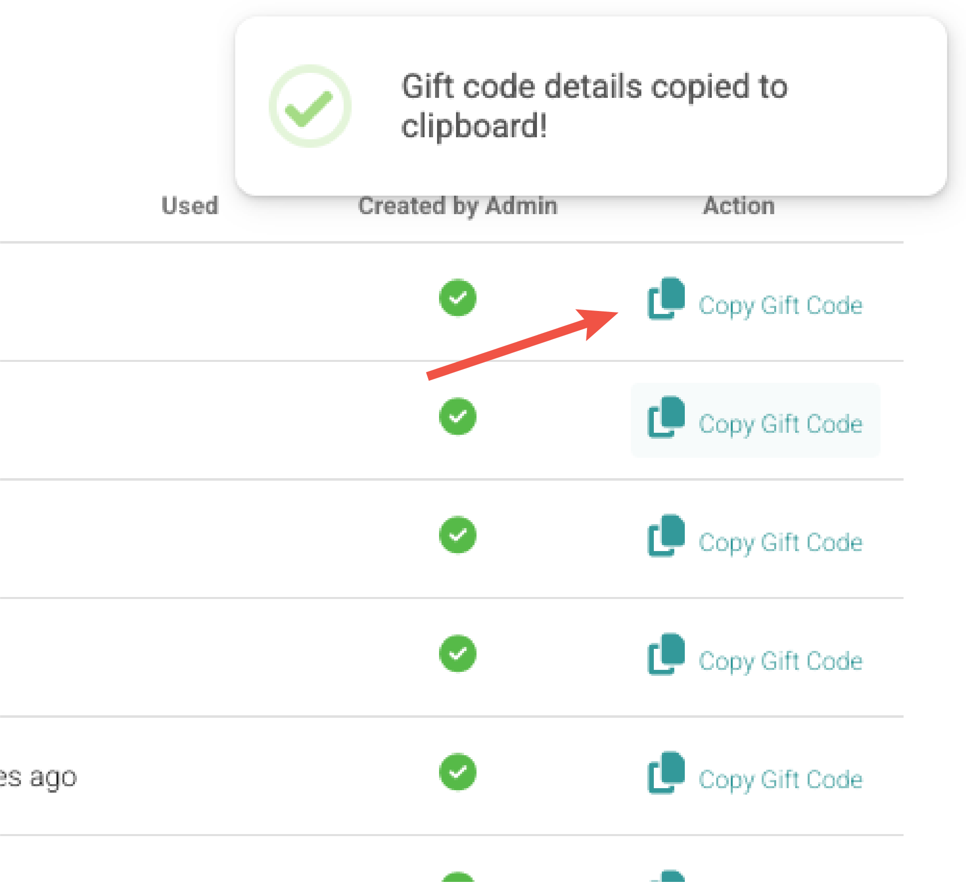 Select the relevant voucher and click the Copy gift code button at the right hand side. This will copy the following details to the clipboard. e.g:
